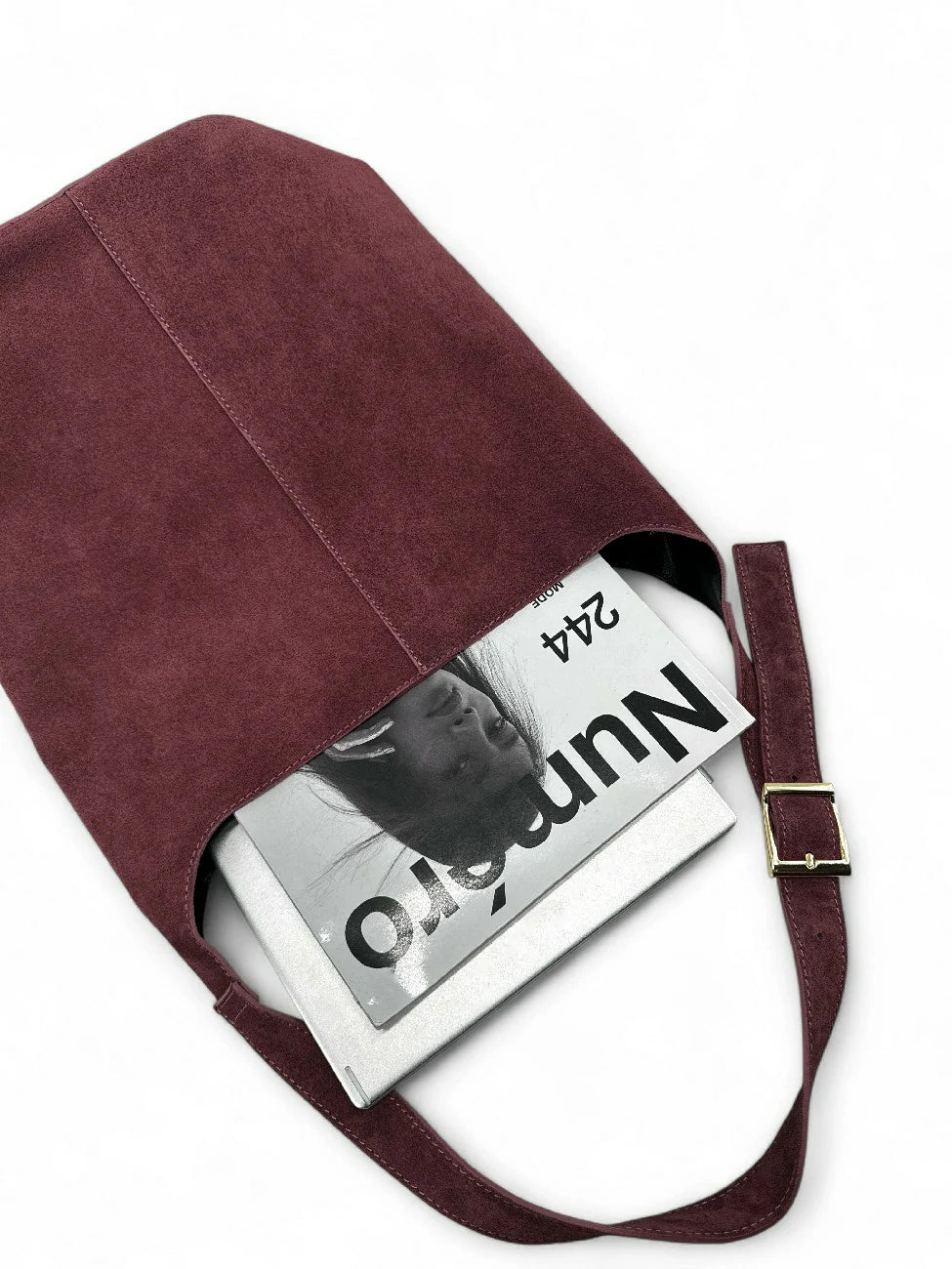 Sac seau en cuir nubuck bordeaux avec pochette assortie, porté épaule, fabriqué en Italie.