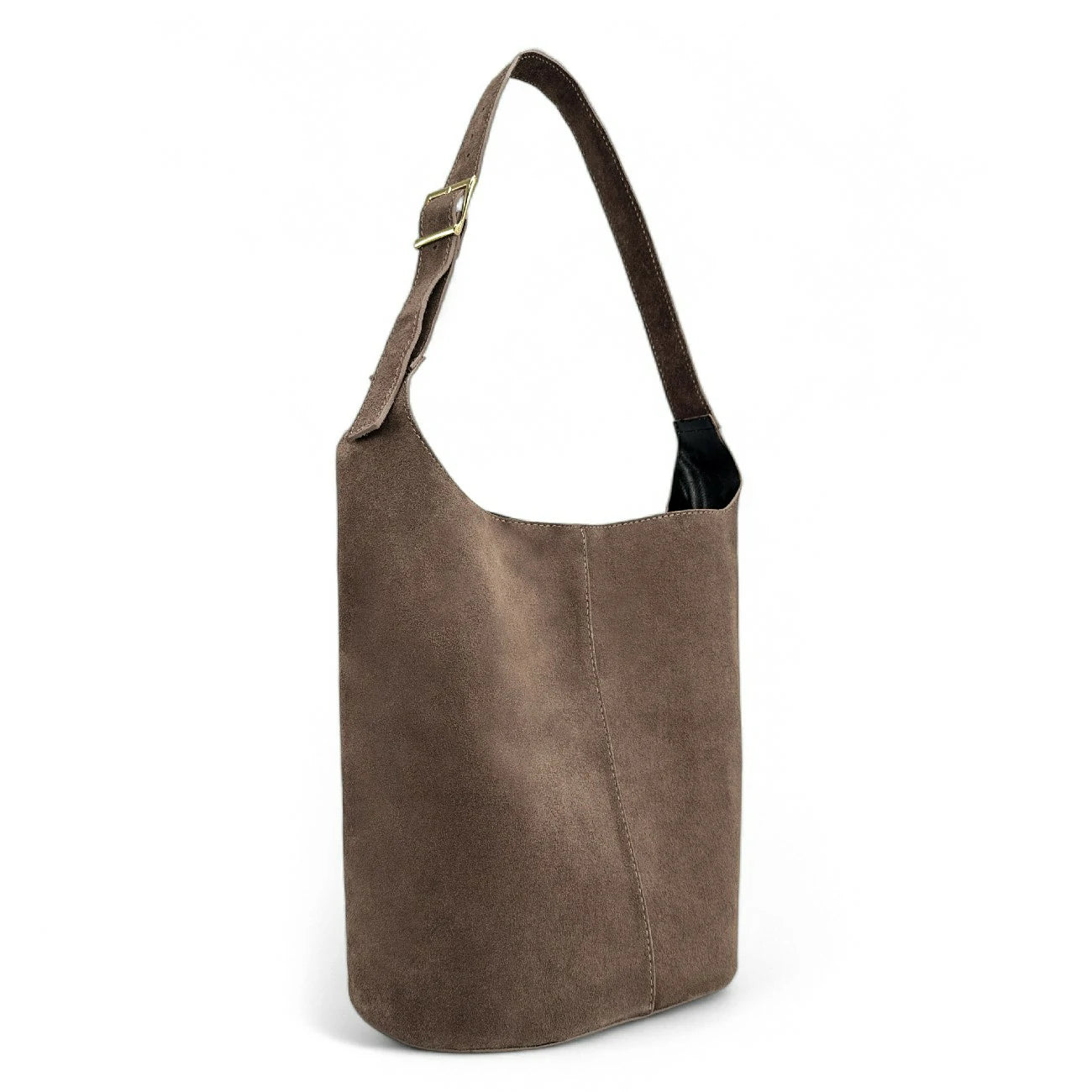 Sac seau en cuir nubuck taupe foncé avec pochette assortie, porté épaule, fabriqué en Italie.