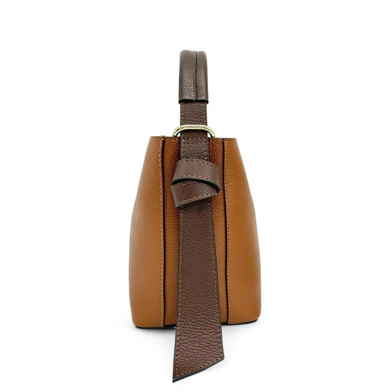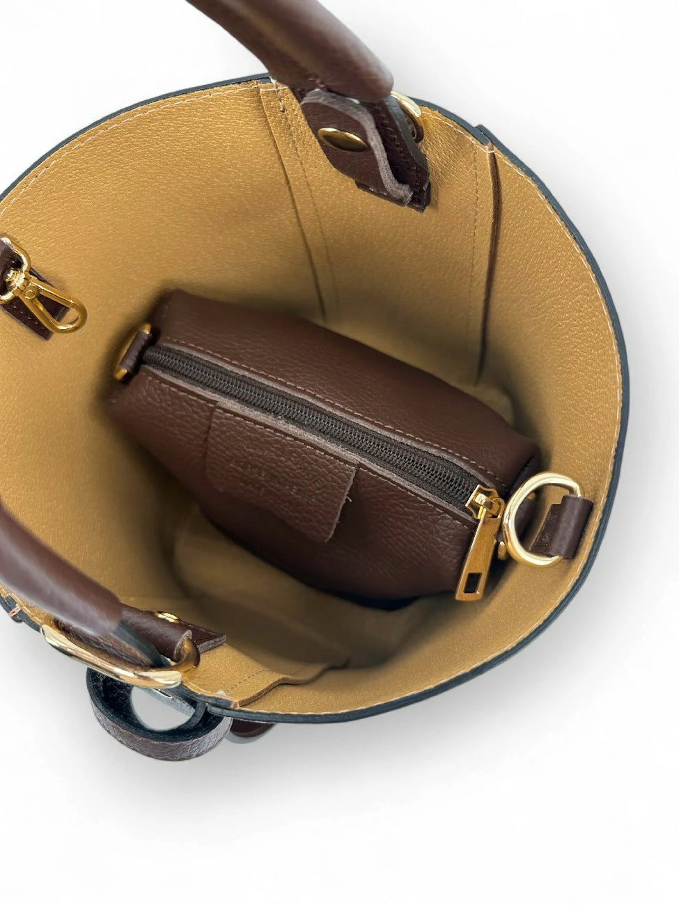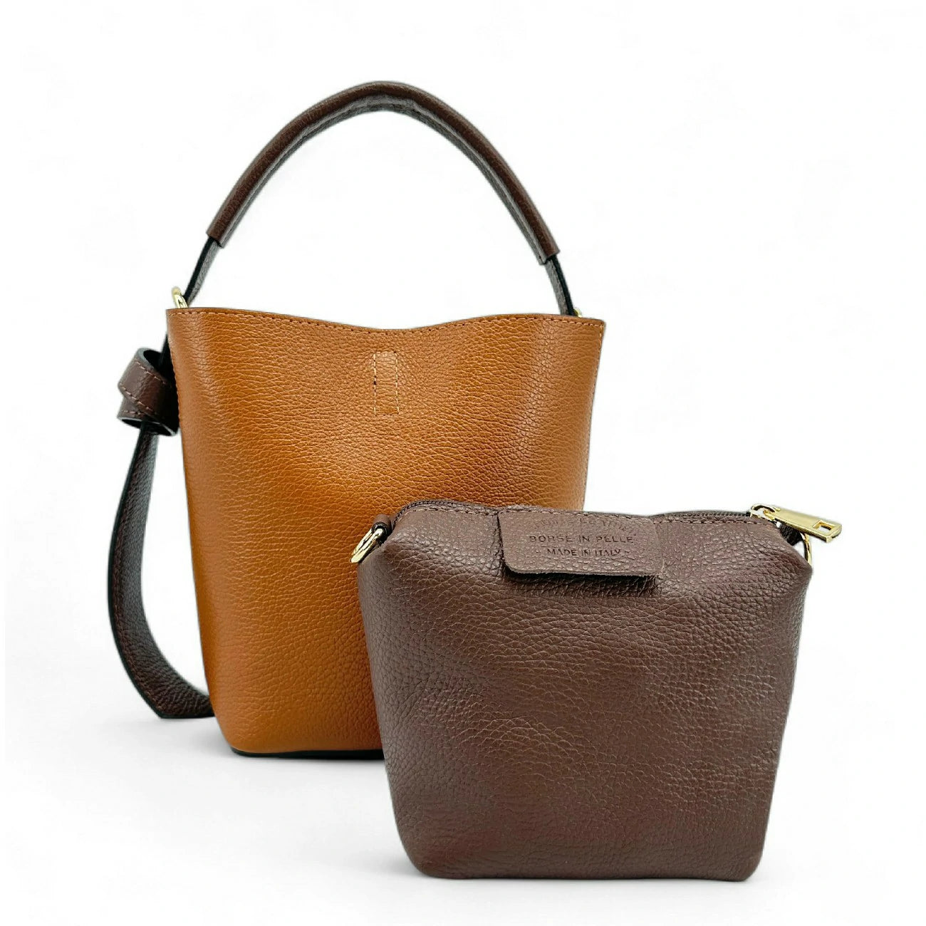 Sac seau multi-positions et pochette en cuir grainé camel foncé & chocolat, porté main, coude ou épaule, fabriqué en Italie.