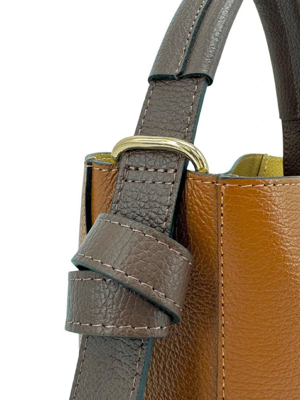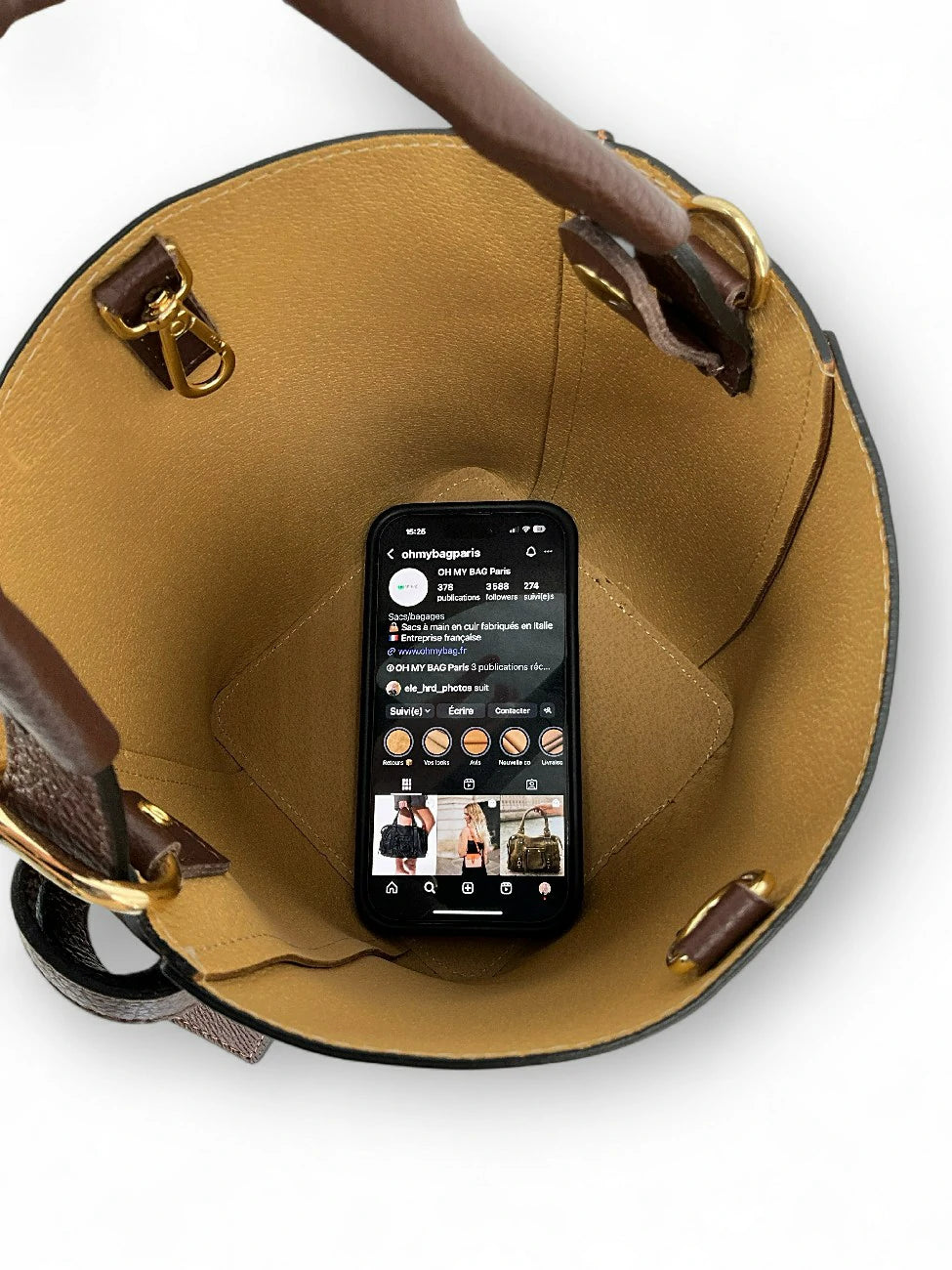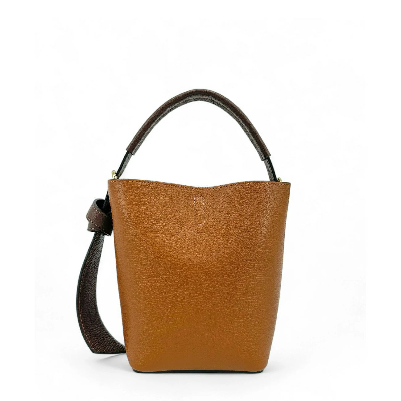Sac seau multi-positions et pochette en cuir grainé camel foncé & chocolat, porté main, coude ou épaule, fabriqué en Italie.